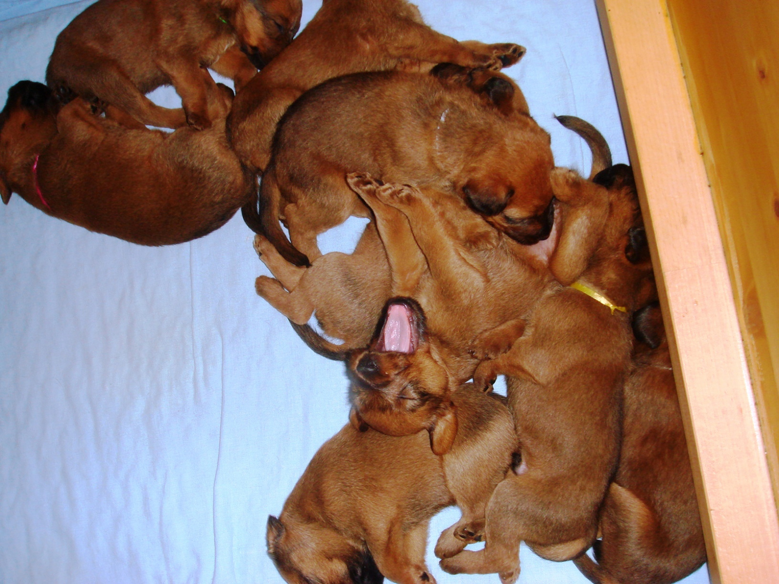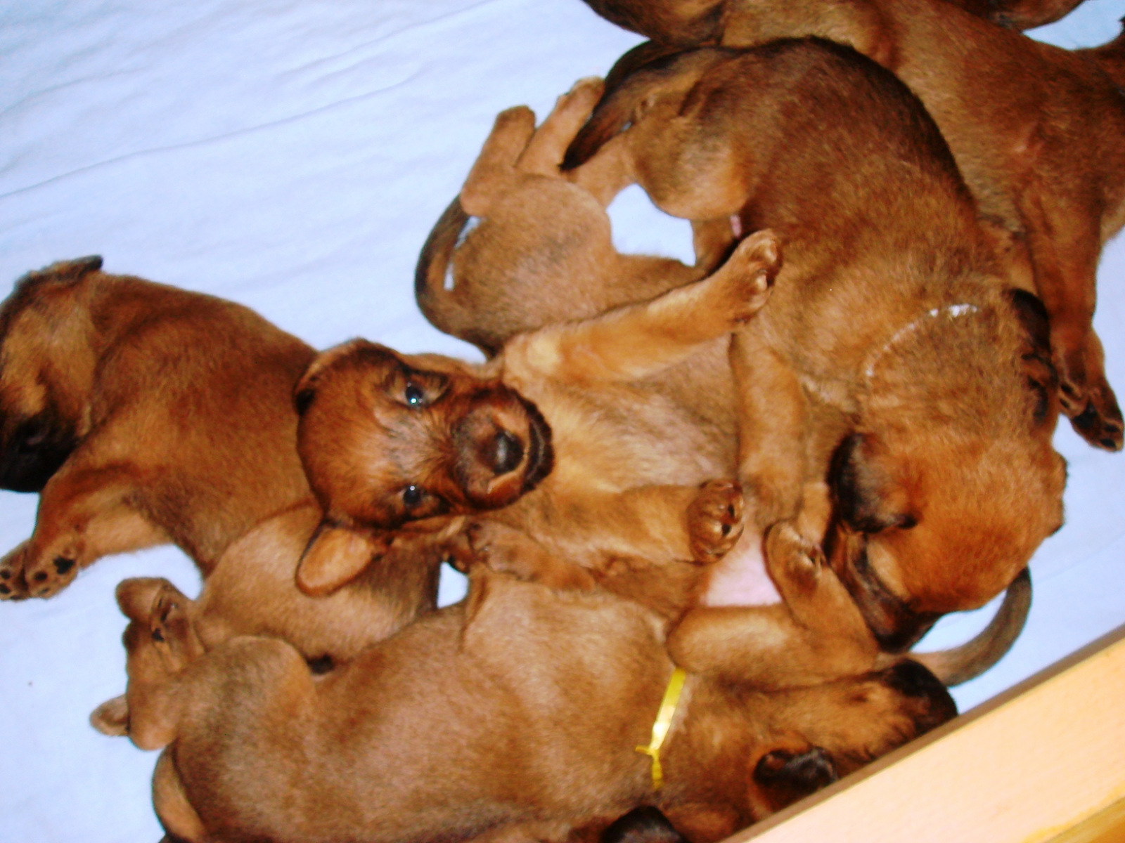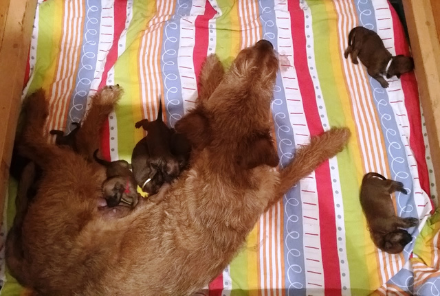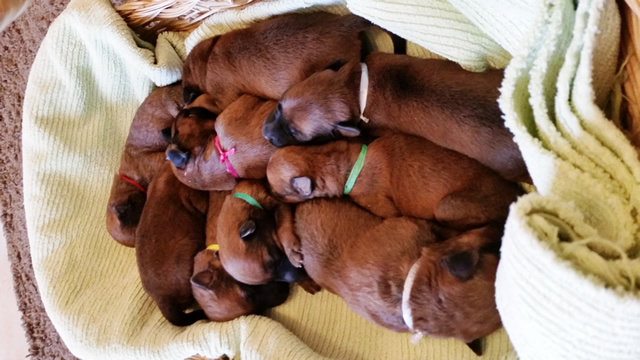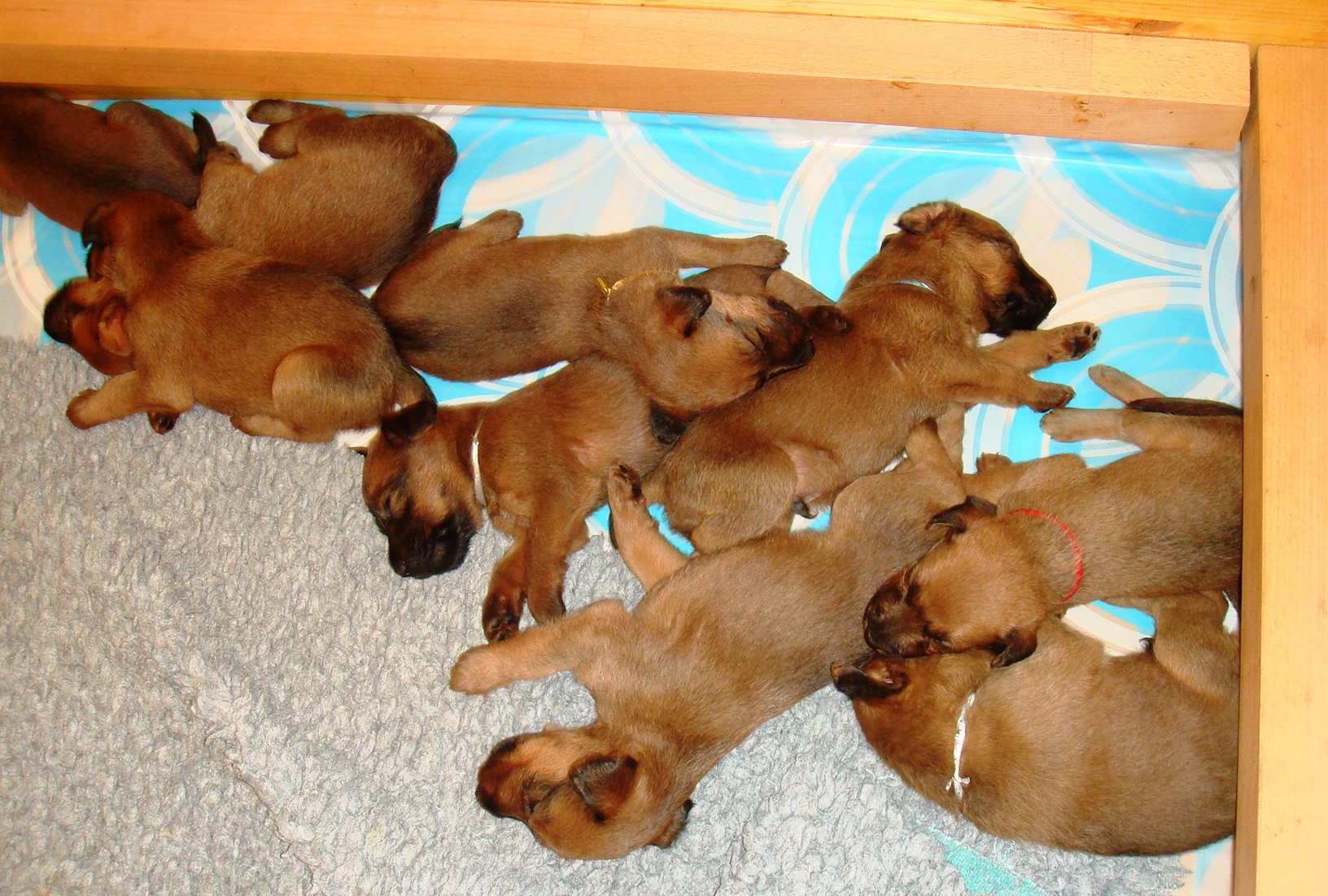 Anfang Februar 2015 wurde unsere Aimee wieder von Niall vom Hürtgenwald gedeckt. Am 12.04.2015 schenkte sie uns 9 muntere Sonntagswelpen, 3 Rüden und 6 Hündinnen, unseren F-Wurf. Auch diesmal war es wieder eine gelungene Verbindung. Die große Rasselbande hat uns ganz schön auf Trab gehalten.