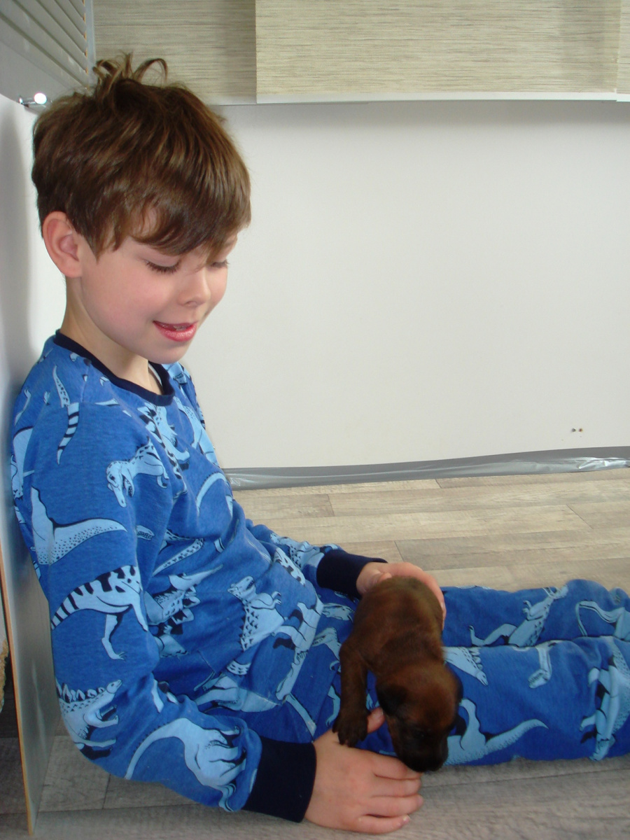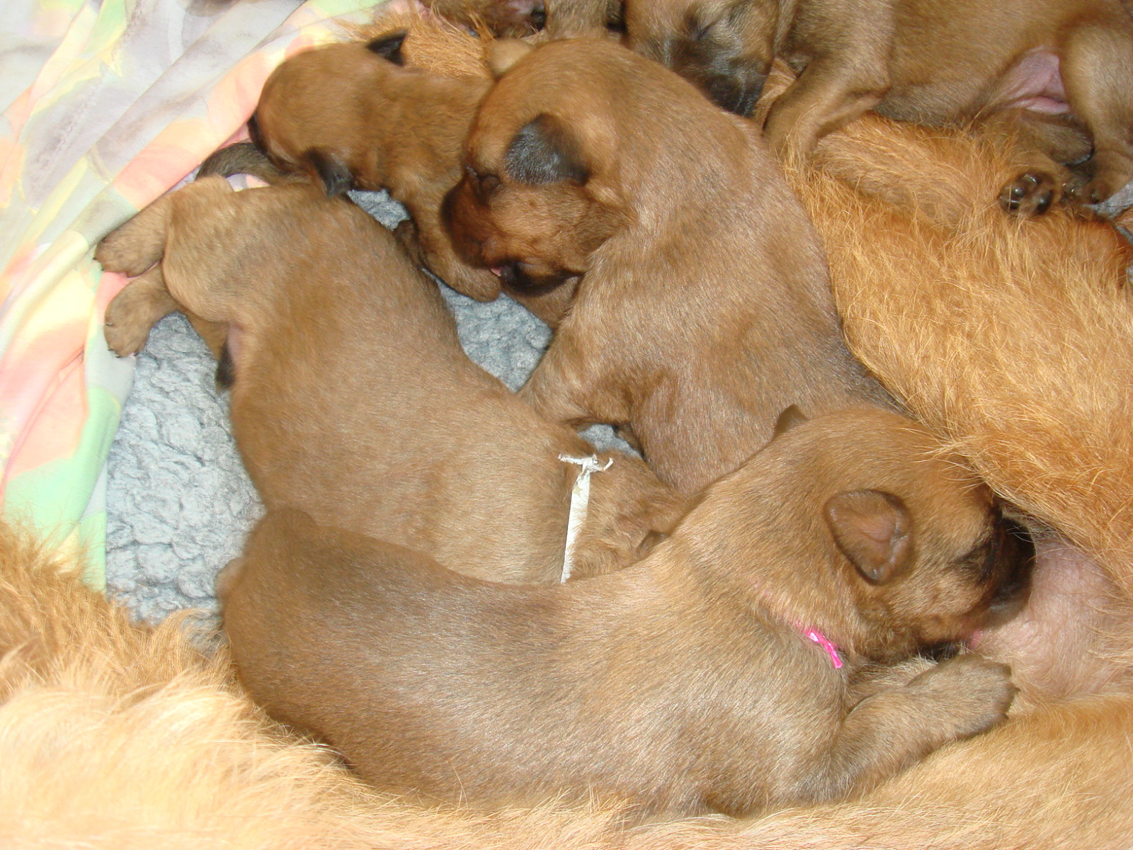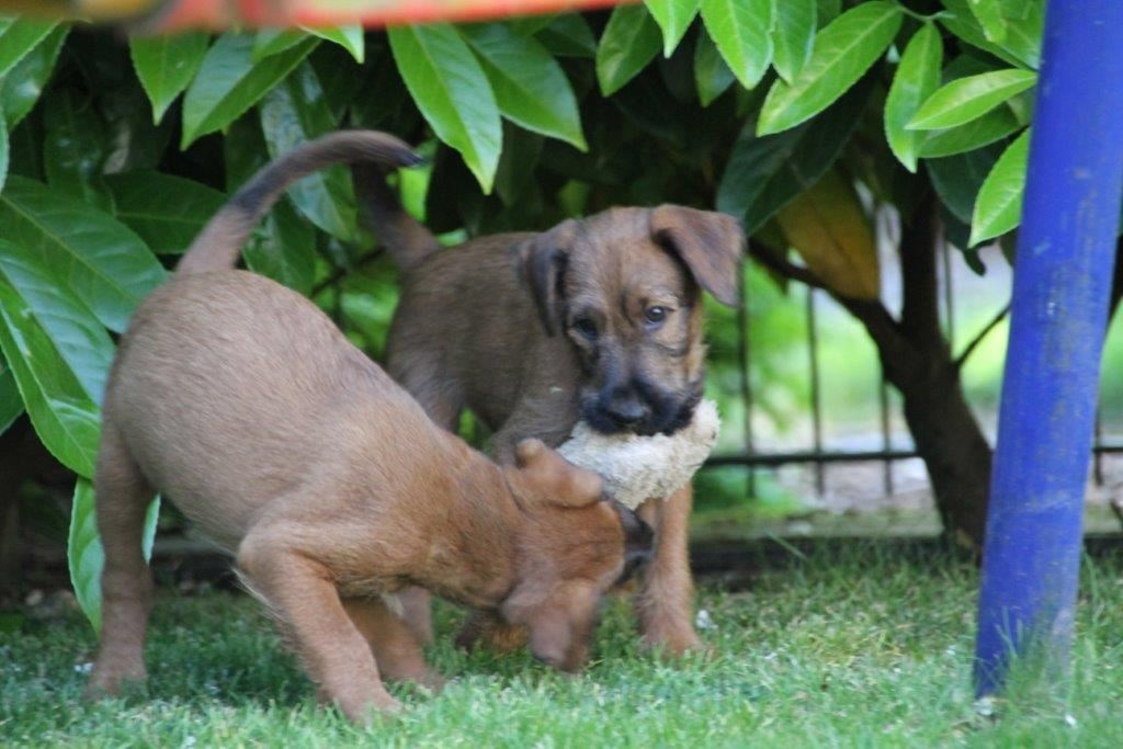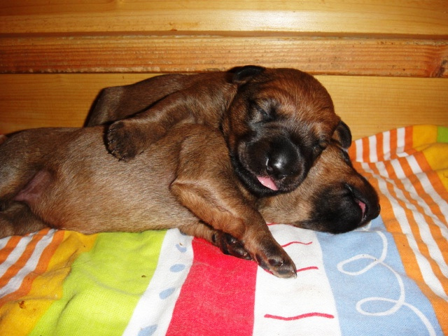 Anfang Februar 2015 wurde unsere Aimee wieder von Niall vom Hürtgenwald gedeckt. Am 12.04.2015 schenkte sie uns 9 muntere Sonntagswelpen, 3 Rüden und 6 Hündinnen, unseren F-Wurf. Auch diesmal war es wieder eine gelungene Verbindung. Die große Rasselbande hat uns ganz schön auf Trab gehalten.
