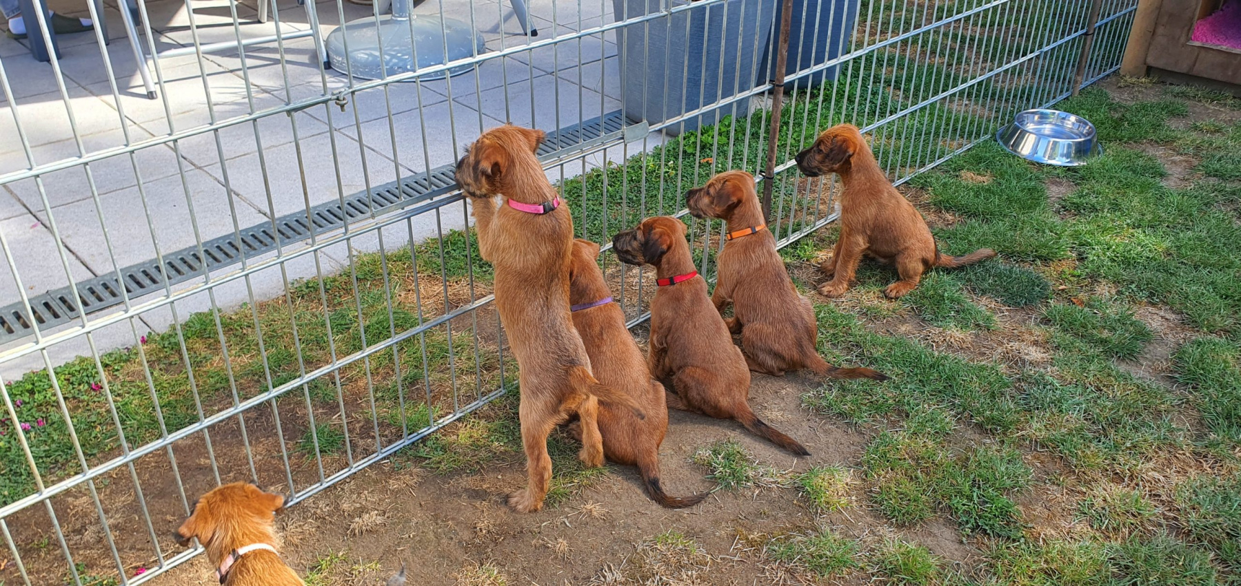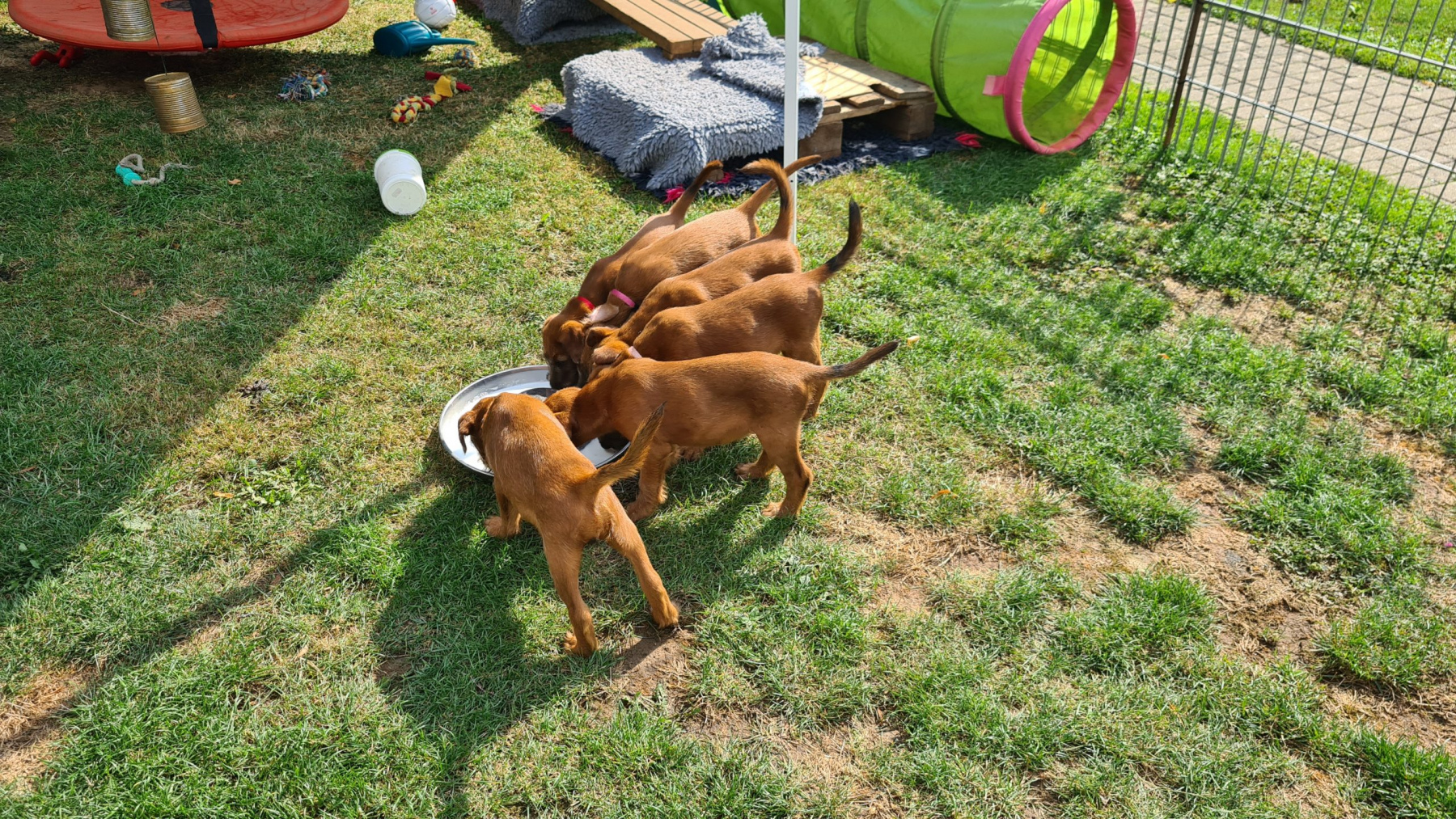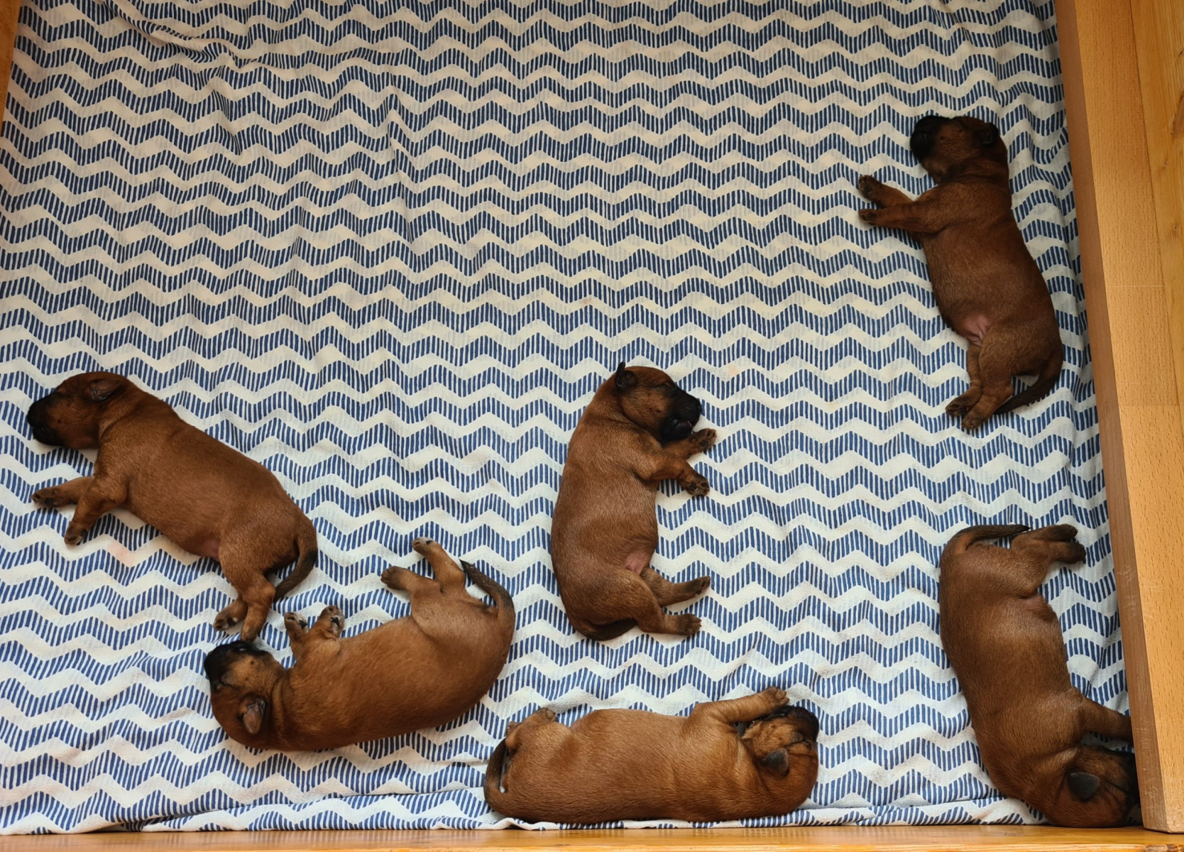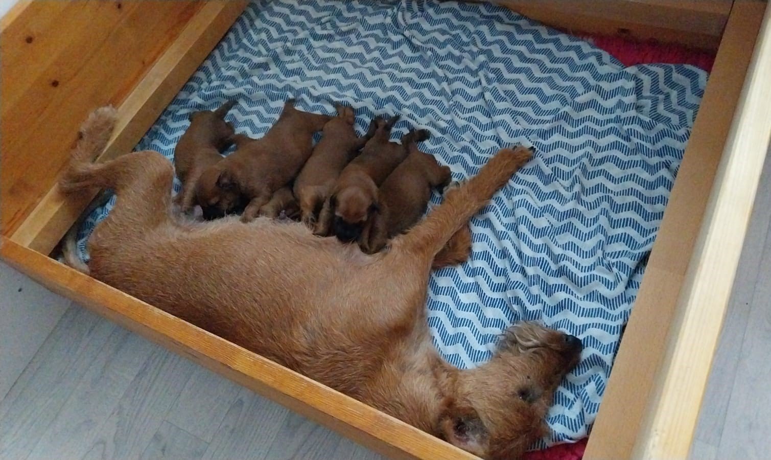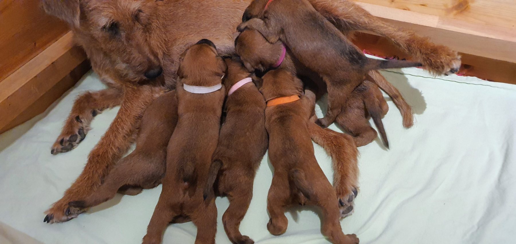 Mitte Mai wurde unsere Juna (Fireflash Juna Ellbroock) wieder von Noah (Hannes Irish vom Ellbach) gedeckt. Wir haben eine Wurfwiederholung vom N-Wurf gemacht, da die Welpen besonders gut gelungen sind. Am 19.07.2025 sind dann 6 kleine Welpen geboren. Es sind 1 Rüde und 5 Hündinnen. Die Welpen entwickeln sich prächtig und Juna versorgt sie sehr gut. Wir sind wieder sehr froh und dankbar.