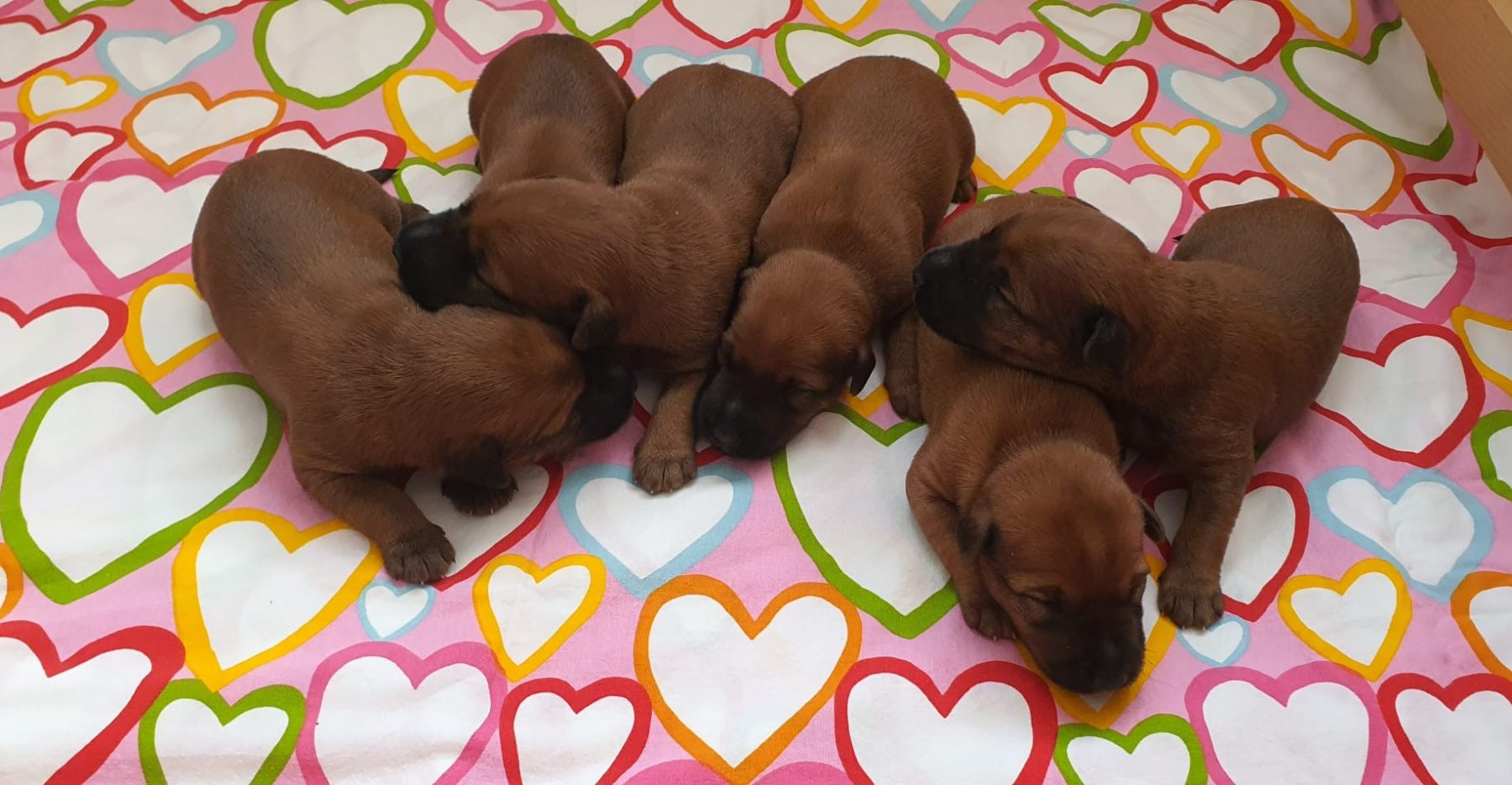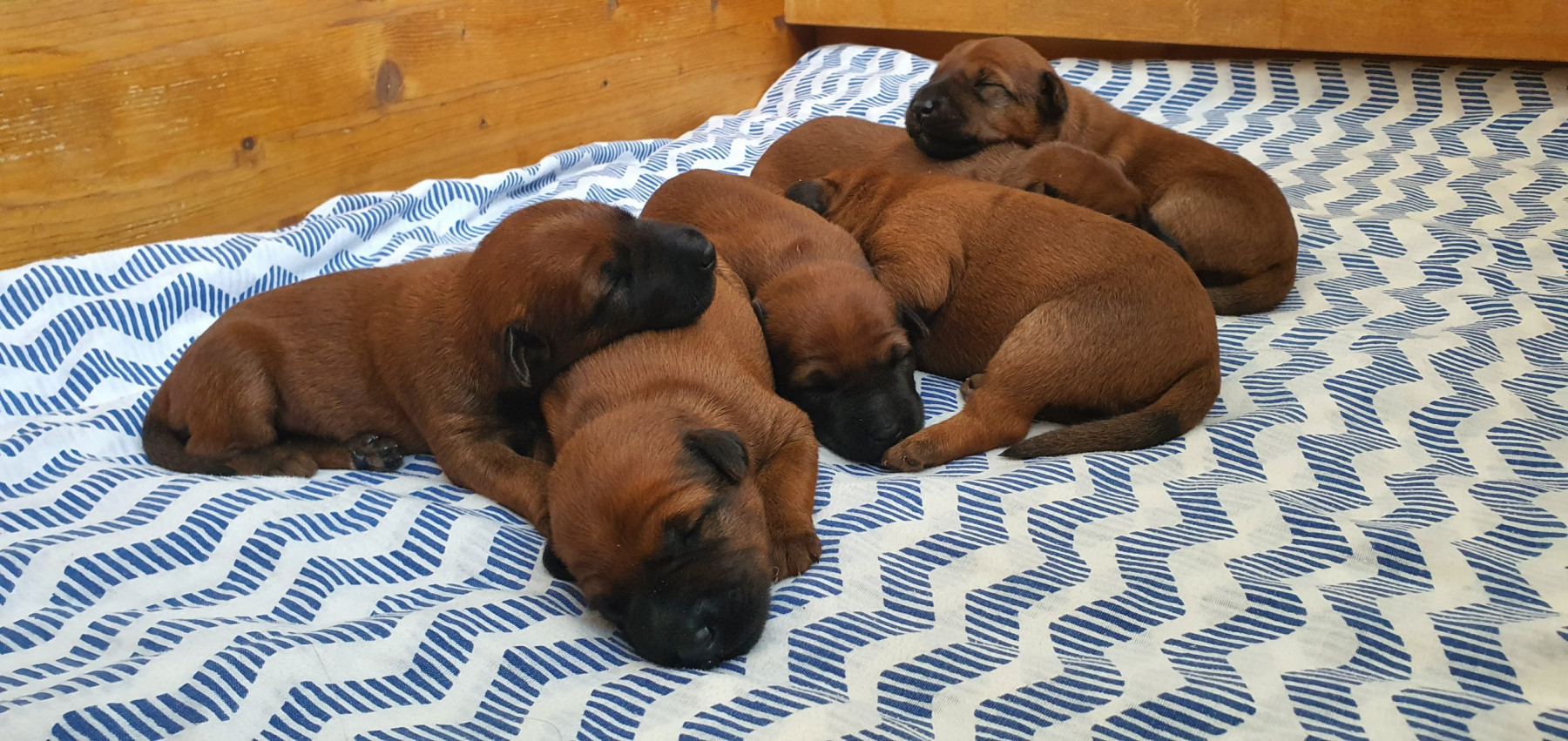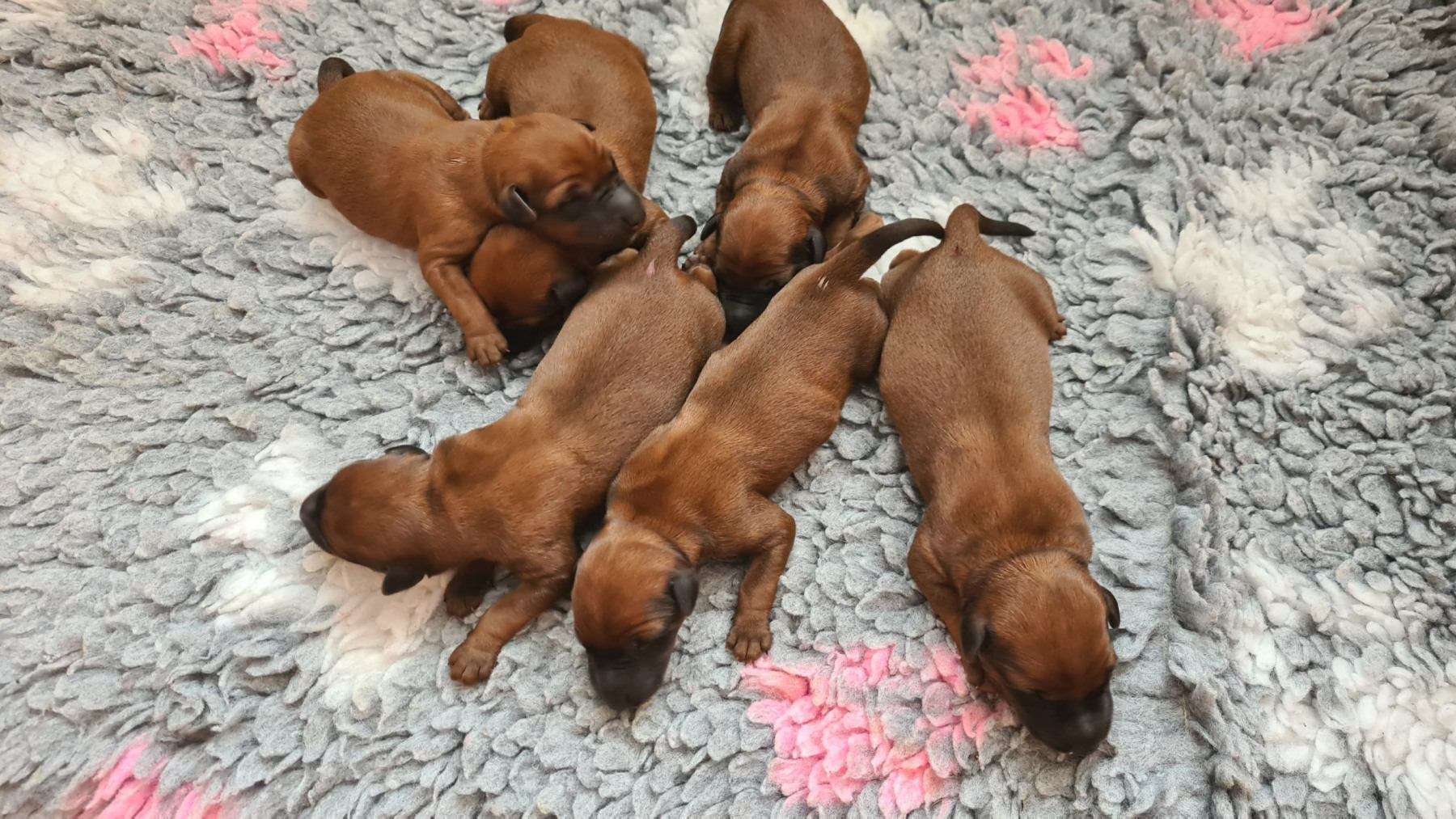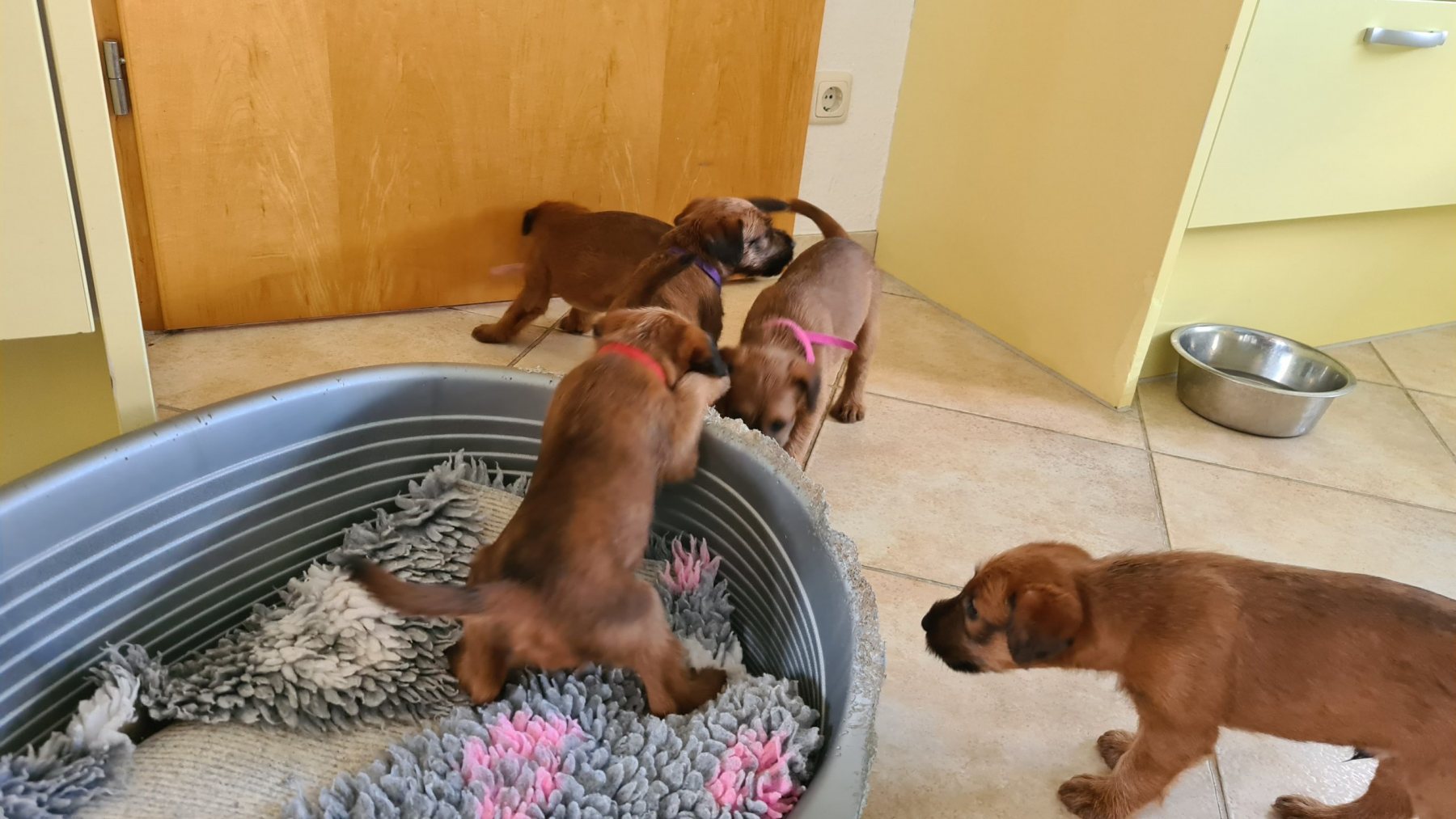 Mitte Mai wurde unsere Juna (Fireflash Juna Ellbroock) wieder von Noah (Hannes Irish vom Ellbach) gedeckt. Wir haben eine Wurfwiederholung vom N-Wurf gemacht, da die Welpen besonders gut gelungen sind. Am 19.07.2025 sind dann 6 kleine Welpen geboren. Es sind 1 Rüde und 5 Hündinnen. Die Welpen entwickeln sich prächtig und Juna versorgt sie sehr gut. Wir sind wieder sehr froh und dankbar.